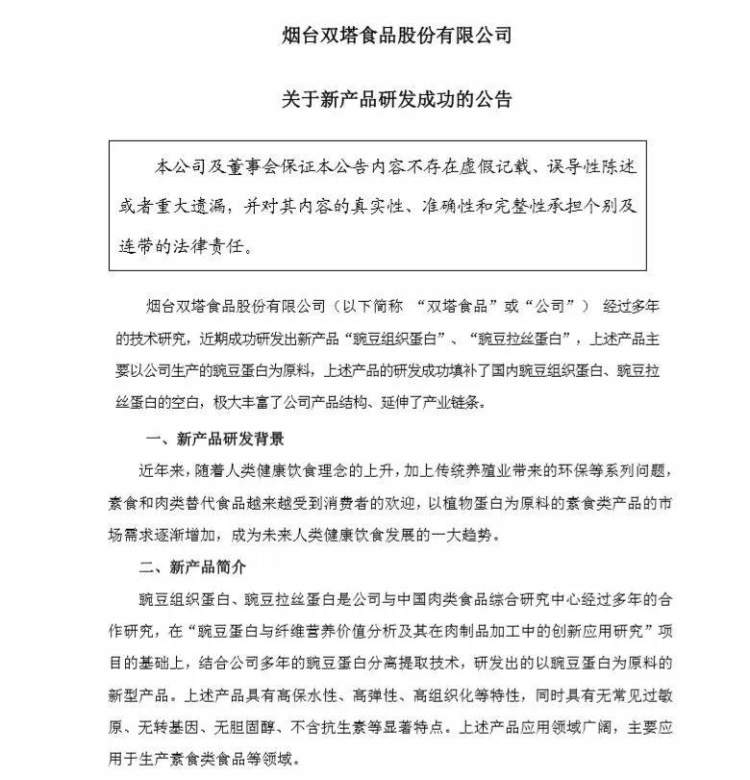 6月6日晚间,双塔食品(002481)公告称,公司近期成功研发出新产品“豌豆组织蛋白”、“豌豆拉丝蛋白”,产品主要以公司生产的豌豆蛋白为原料。上述产品研发成功填补了国内豌豆组织蛋白、豌豆拉丝蛋白的空白,极大丰富了公司产品结构、延伸了产业链条。”对公司未来经营业绩的影响尚取决于相关政策、实际市场销售情况。”
