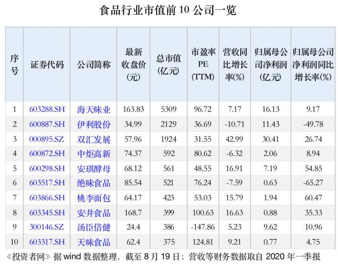 截至8月19日,海天味业的股价报收163.83元/股,市值高达5309亿元,超过伊利股份和双汇发展两大食品饮料龙头的市值之和。凭借这一市值,海天味业跻身中国上市公司市值排行榜的前20位。