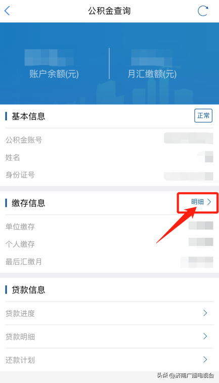 3、点击页面中“明细”,即可查看公积金缴存明细及结息金额。