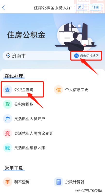 2、选择切换所在地区后,点击进入“公积金查询”;