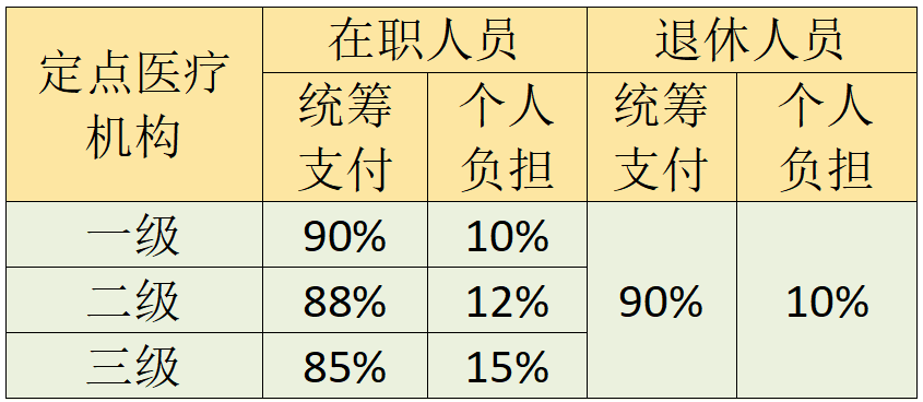 符合条件足额享受待遇的参保人在起付线以上、最高支付限额以下的合规医疗费用分担比例,在职参保人员与退休人员有所区别: